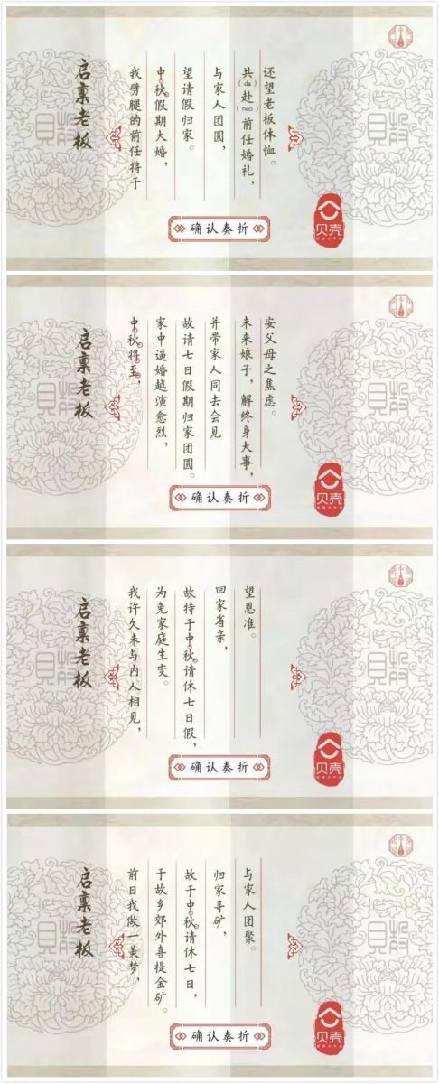 贝壳找房借“风靡故宫的心机假条”H5,用传统奏折的形式,将传统文化进行了很好的融合,并以动态丹青图展示,从周朝到明朝每个朝代介绍中秋节的由来与发展,并以八款假条供用户挑选,诚意满满中又不失小心机,颇得职场人心。
